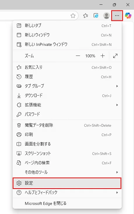 Edgeを開き、右上の「・・・」(設定など)アイコンをクリックし、メニューから「設定」を選択します。