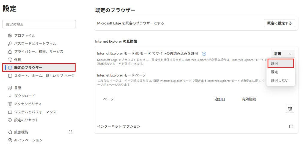 左側のメニューから「既定のブラウザー」を選択します。「Internet Explorer モード (IE モード) でサイトの再読み込みを許可」という項目を、「既定」から「許可」に変更します。